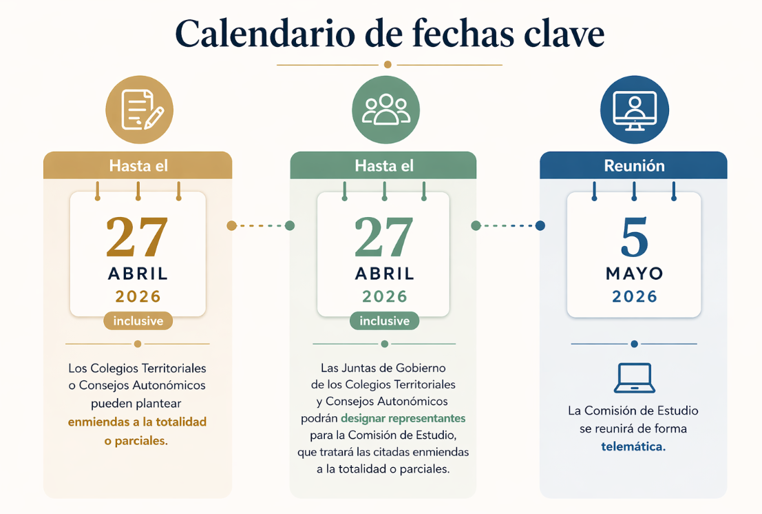 También hasta el día 27 de abril de 2026 inclusive, las Juntas de Gobierno de los Colegios Territoriales y Consejos Autonómicos podrán designar representantes para la Comisión de Estudio, que tratará las citadas enmiendas a la totalidad o parciales.